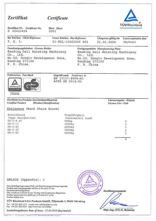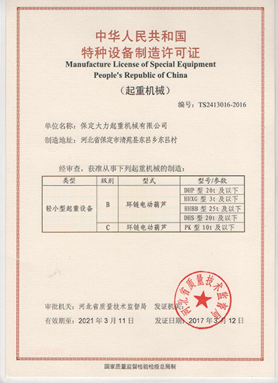 • 環(huán)鏈電動(dòng)葫蘆生產(chǎn)許可證