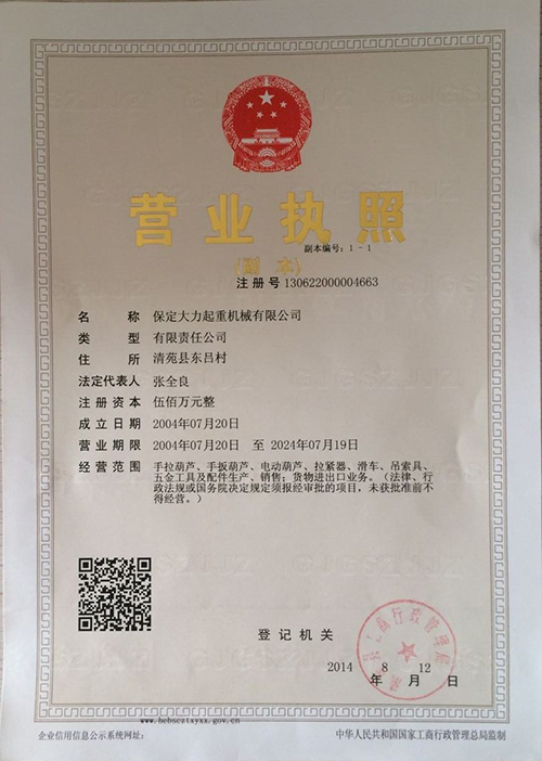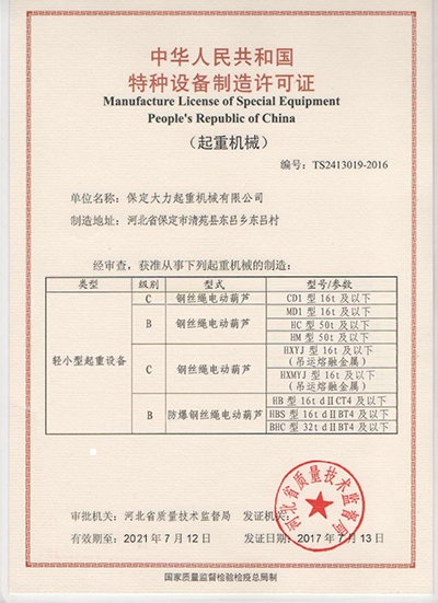 • 鋼絲繩電動(dòng)葫蘆生產(chǎn)許可證