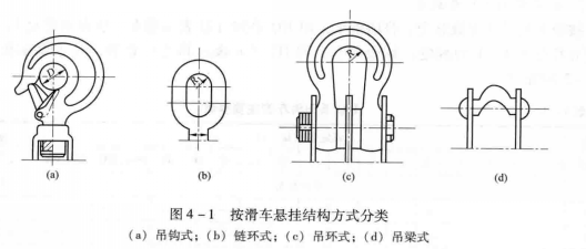 按滑車懸掛結構方式(或稱連接方式)分為吊鉤式、鏈環(huán)式、吊環(huán)式和吊梁式4種,如圖4—1所示。