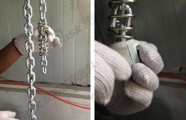 第二步:準(zhǔn)備好的鏈條無吊鉤一端,懸掛在有缺口的鏈花上;保證鏈條焊接點方向一致。