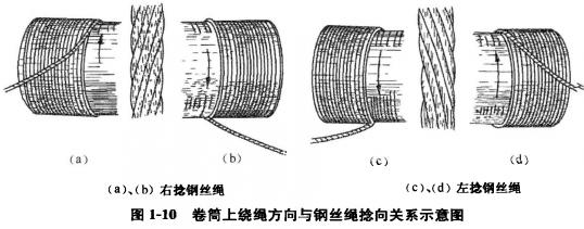 1、纏繞。如由鋼絲繩卷直接往起升就卷筒上纏繞時(shí),應(yīng)注意兩點(diǎn):一是應(yīng)把整卷鋼絲繩架設(shè)在專用的旋轉(zhuǎn)托架或支座上,松卷時(shí)的轉(zhuǎn)動方向應(yīng)與起升機(jī)構(gòu)卷筒上纏繞的方向一致;而是卷筒上的繩槽走向應(yīng)同鋼絲繩的捻向相適應(yīng)。如果鋼絲繩在繩槽方向是從左向右,鋼絲繩是右捻,要從卷筒上方引入卷繞,如圖1-10(a)所示;倘若鋼絲繩在繩槽走向是從右向左,鋼絲繩是右捻,則要從卷筒下方引入卷筒,如圖1-10(b)所示;若鋼絲繩在繩槽走向是從左向右,鋼絲繩是左捻、要從卷筒下方引入卷繞,如圖1-10(c)所示;如果鋼絲繩在繩槽走向是從右向左,剛繩是左捻,則要從卷筒上方引入卷繞,如圖1-10(d)所示。