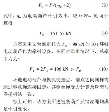 環(huán)鏈電動葫蘆與換流變掛點(diǎn)、錨點(diǎn)之間同樣需通過鋼絲繩連接固定,其鋼絲繩受力計(jì)算及選型與卷揚(yáng)機(jī)法一致。綜上可知,該方案所選鏈條葫蘆及鋼絲繩均滿足牽引要求。