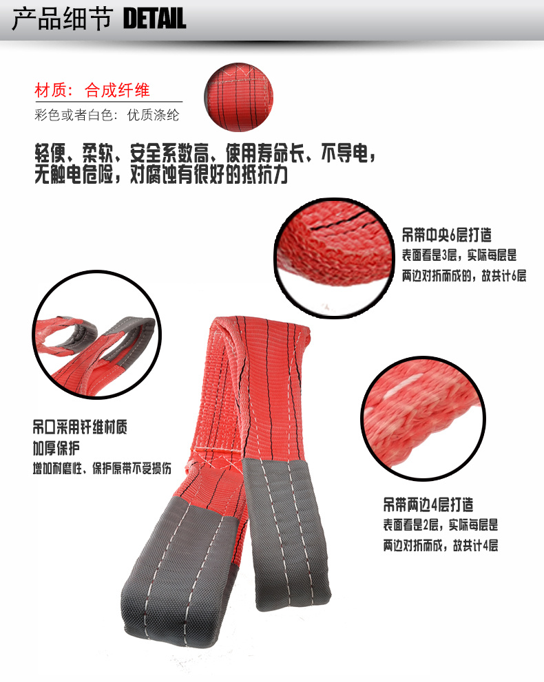 吊裝帶一般采用高強(qiáng)力聚酯長絲制作,具有強(qiáng)度高、耐磨損、抗氧化、抗紫外線等多重優(yōu)點(diǎn)??梢苑譃椋涵h(huán)形穿芯吊裝帶、環(huán)形扁平吊裝帶、雙眼穿芯吊裝帶、雙眼扁平吊裝帶四類。